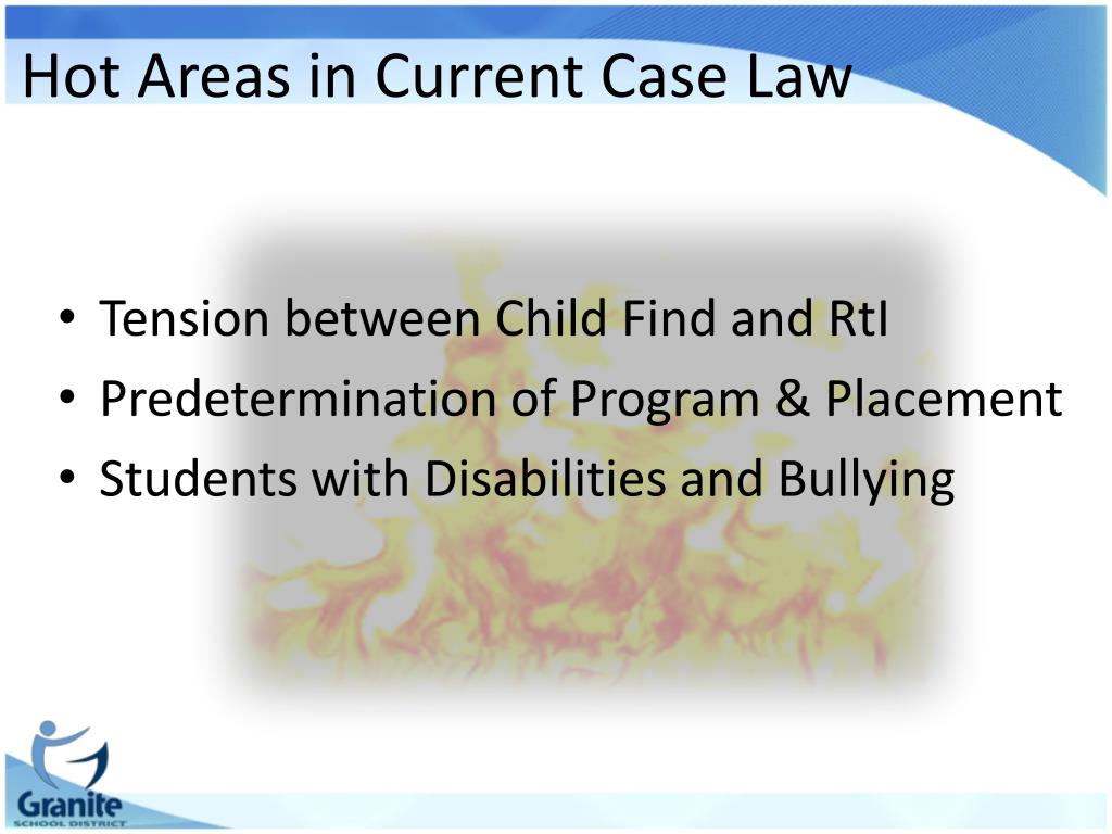 Hot Areas in Current Case Law • Tension between Child Find and RtI • Predetermination of Program & Placement • Students with Disabilities and Bullying
