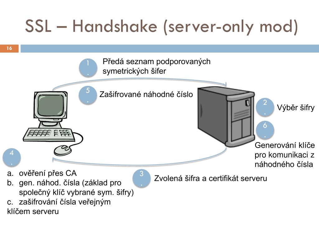 SSL – Handshake (server-only mod) Předá seznam podporovaných symetrických šifer 1. 5. Zašifrované náhodné číslo 2. Výběr šifry 6. Generování klíče pro komunikaci z náhodného čísla 4. • ověření přes CA • gen. náhod. čísla (základ prospolečný klíč vybrané sym. šifry) • zašifrování čísla veřejným • klíčem serveru 3. Zvolená šifra a certifikát serveru