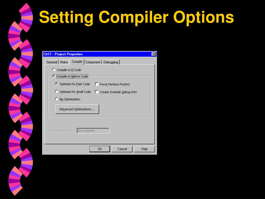 The Visual Basic Compiler • Visual Basic produces two types of code • P-code (pseudocode) is tokenized intermediate code requiring the full services of the run time library • Cannot run on its own • Is interpreted • Native code is true executable code • Executes more rapidly