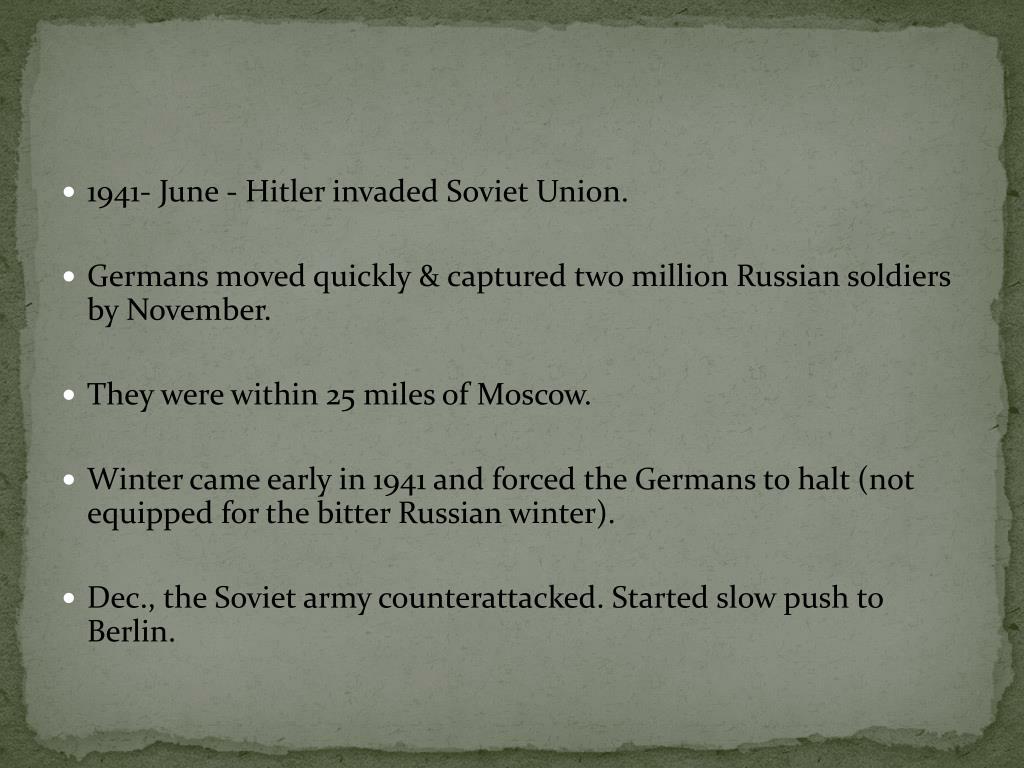 1941- June - Hitler invaded Soviet Union. • Germans moved quickly & captured two million Russian soldiers by November. • They were within 25 miles of Moscow. • Winter came early in 1941 and forced the Germans to halt (not equipped for the bitter Russian winter). • Dec., the Soviet army counterattacked. Started slow push to Berlin.
