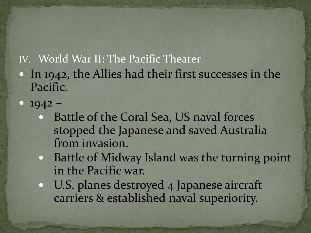 World War II: The Pacific Theater • In 1942, the Allies had their first successes in the Pacific. • 1942 – • Battle of the Coral Sea, US naval forces stopped the Japanese and saved Australia from invasion. • Battle of Midway Island was the turning point in the Pacific war. • U.S. planes destroyed 4 Japanese aircraft carriers & established naval superiority.