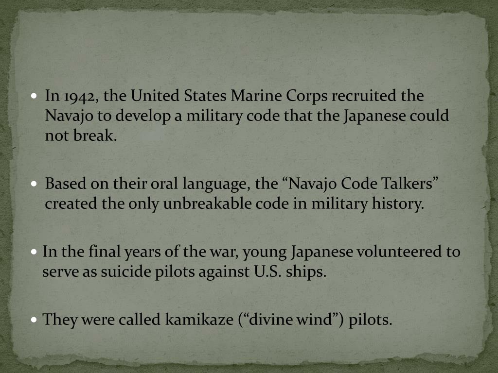 In 1942, the United States Marine Corps recruited the Navajo to develop a military code that the Japanese could not break. • Based on their oral language, the “Navajo Code Talkers” created the only unbreakable code in military history. • In the final years of the war, young Japanese volunteered to serve as suicide pilots against U.S. ships. • They were called kamikaze (“divine wind”) pilots.