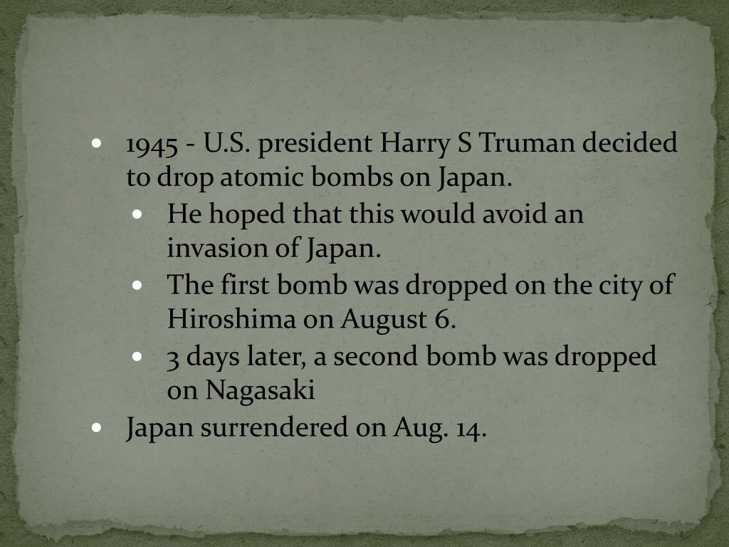 1945 - U.S. president Harry S Truman decided to drop atomic bombs on Japan. • He hoped that this would avoid an invasion of Japan. • The first bomb was dropped on the city of Hiroshima on August 6. • 3 days later, a second bomb was dropped on Nagasaki • Japan surrendered on Aug. 14.