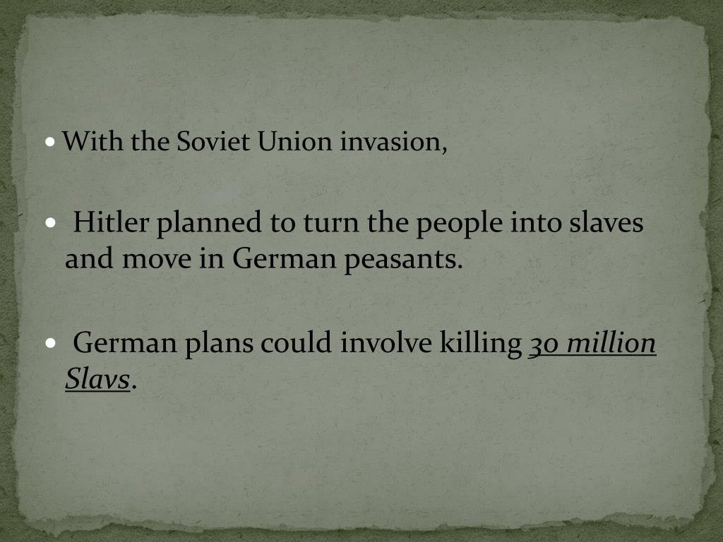 With the Soviet Union invasion, • Hitler planned to turn the people into slaves and move in German peasants. • German plans could involve killing 30 million Slavs.