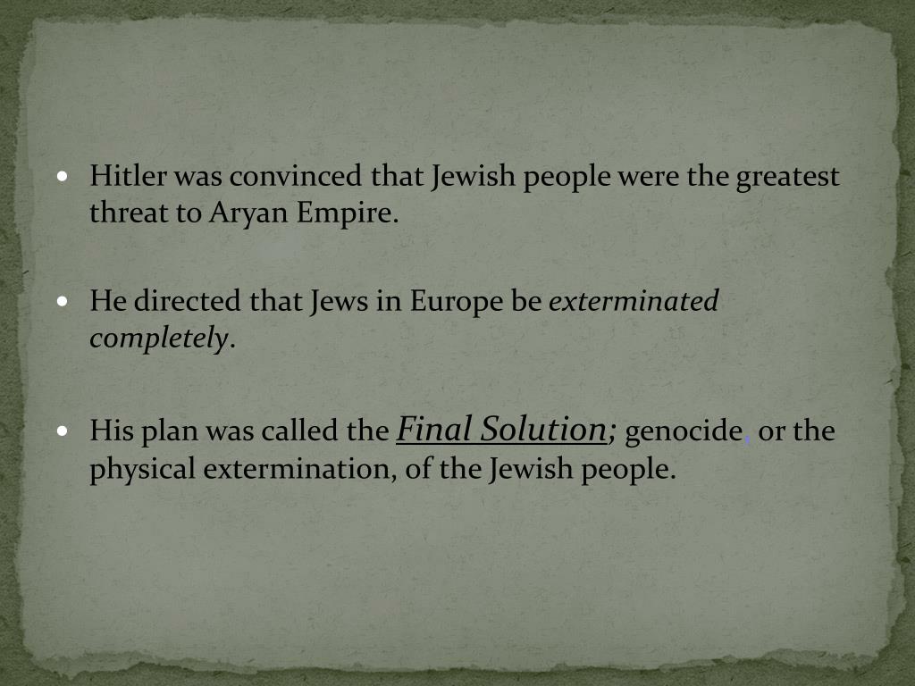 Hitler was convinced that Jewish people were the greatest threat to Aryan Empire. • He directed that Jews in Europe be exterminated completely. • His plan was called the Final Solution; genocide, or the physical extermination, of the Jewish people.