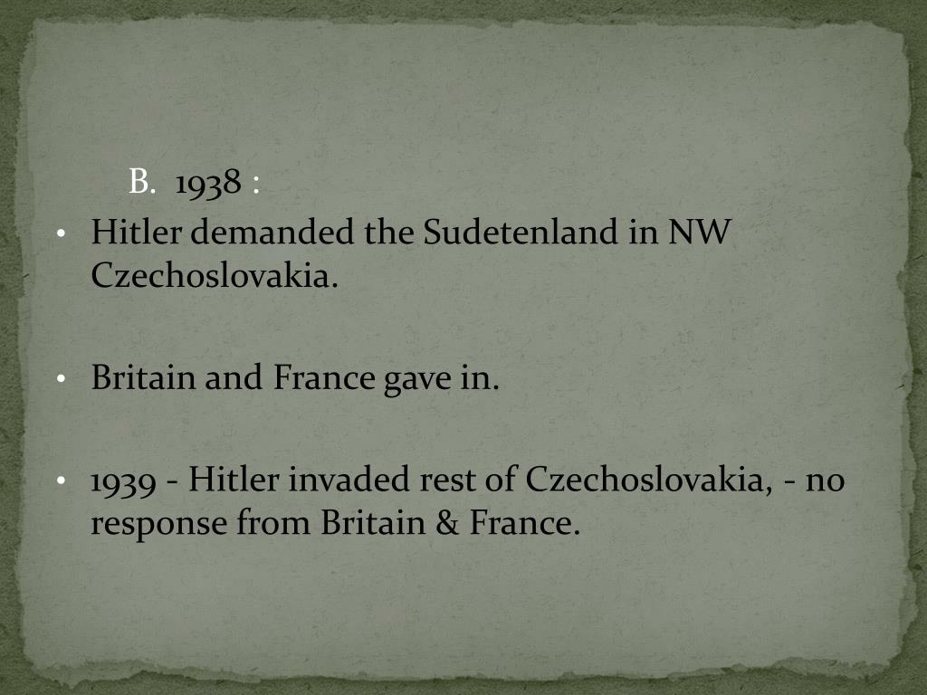 B. 1938 : • Hitler demanded the Sudetenland in NW Czechoslovakia. • Britain and France gave in. • 1939 - Hitler invaded rest of Czechoslovakia, - no response from Britain & France.