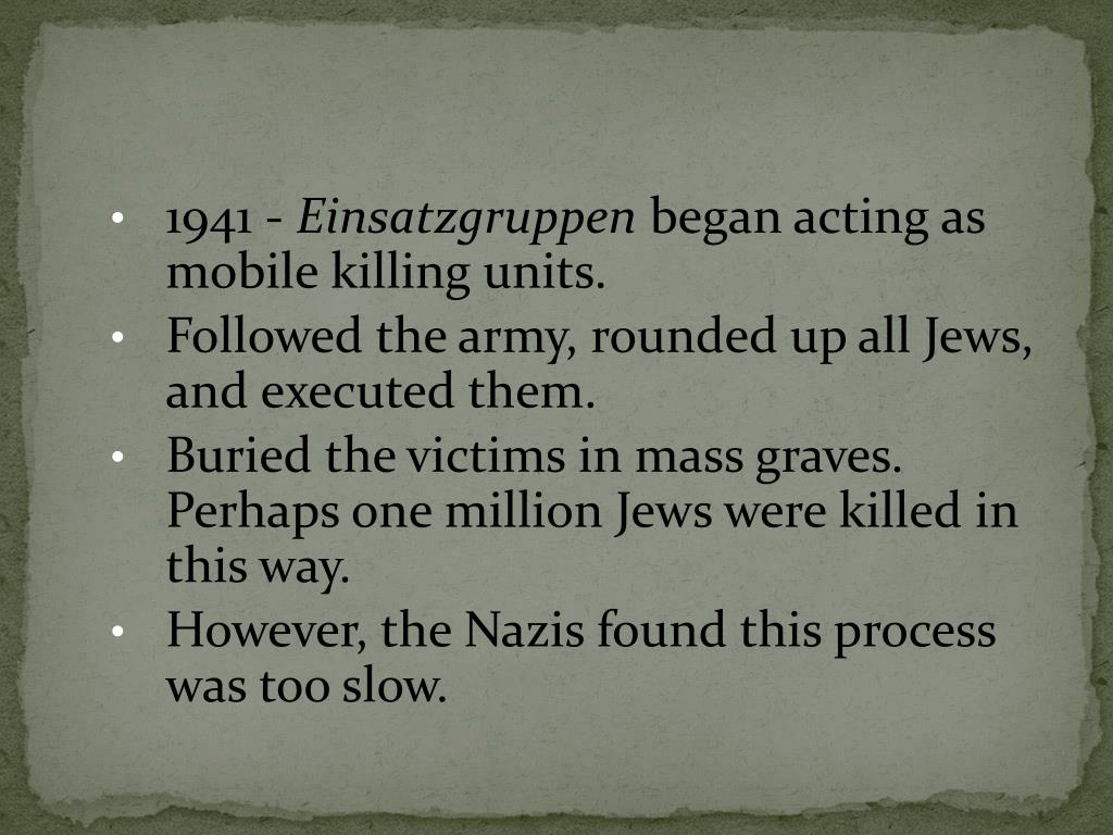 1941 - Einsatzgruppen began acting as mobile killing units. • Followed the army, rounded up all Jews, and executed them. • Buried the victims in mass graves. Perhaps one million Jews were killed in this way. • However, the Nazis found this process was too slow.