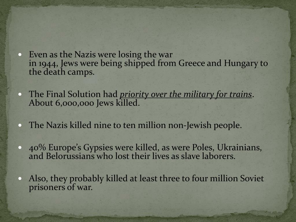 Even as the Nazis were losing the war in 1944, Jews were being shipped from Greece and Hungary to the death camps. • The Final Solution had priority over the military for trains. About 6,000,000 Jews killed. • The Nazis killed nine to ten million non-Jewish people. • 40% Europe’s Gypsies were killed, as were Poles, Ukrainians, and Belorussians who lost their lives as slave laborers. • Also, they probably killed at least three to four million Soviet prisoners of war.