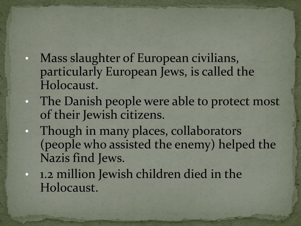 Mass slaughter of European civilians, particularly European Jews, is called the Holocaust. • The Danish people were able to protect most of their Jewish citizens. • Though in many places, collaborators (people who assisted the enemy) helped the Nazis find Jews. • 1.2 million Jewish children died in the Holocaust.
