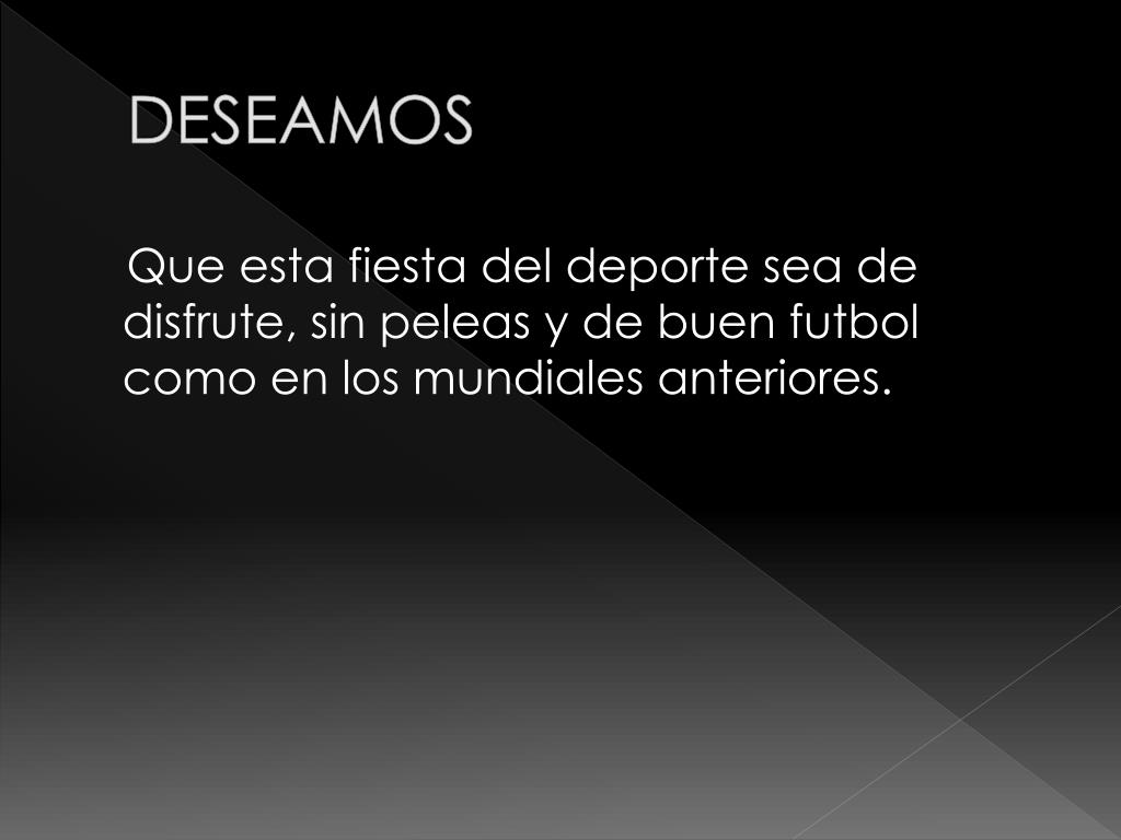 DESEAMOS Que esta fiesta del deporte sea de disfrute, sin peleas y de buen futbol como en los mundiales anteriores.