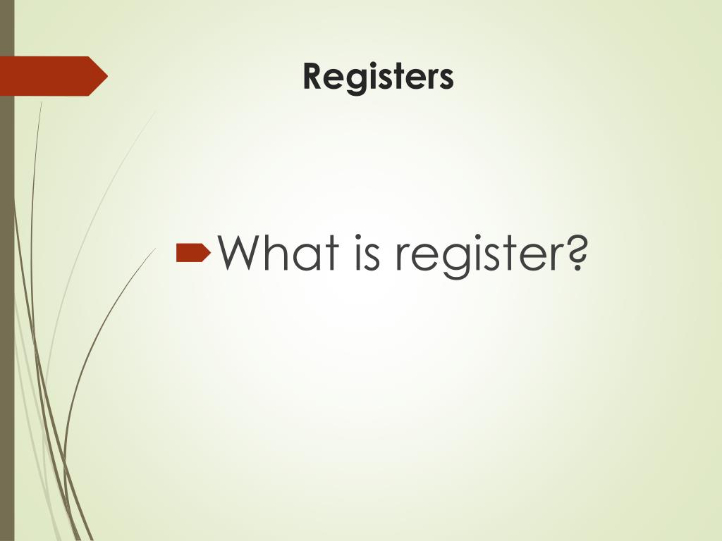 EKT 221/4 DIGITAL ELECTRONICS II. Registers, Micro-operations and Implementations - Part1 . Registers. What is register?. Registers. Register – a collection of binary storage elements In theory, a register is sequential logic which can be defined by a state table