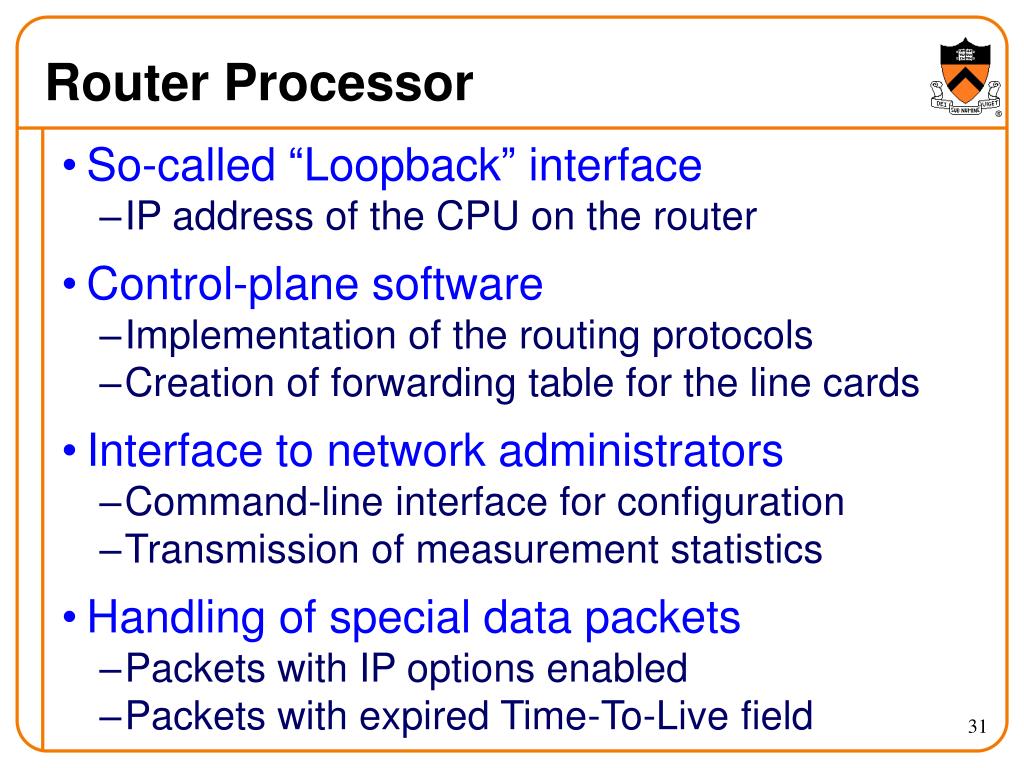 Router Processor • So-called “Loopback” interface • IP address of the CPU on the router • Control-plane software • Implementation of the routing protocols • Creation of forwarding table for the line cards • Interface to network administrators • Command-line interface for configuration • Transmission of measurement statistics • Handling of special data packets • Packets with IP options enabled • Packets with expired Time-To-Live field