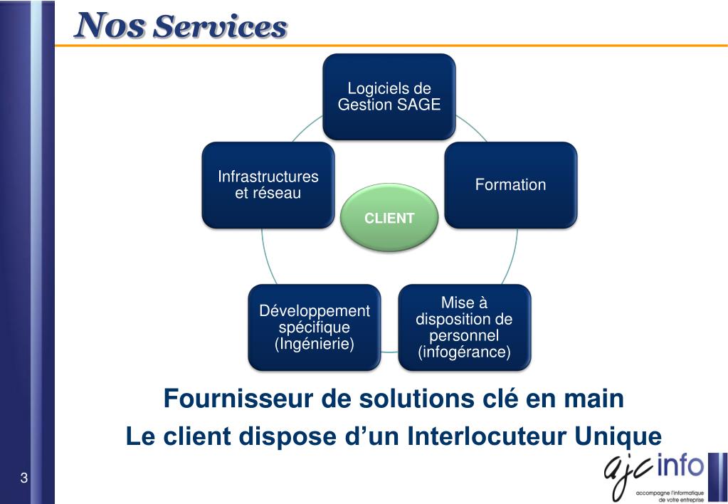 Logiciels de Gestion Sage AJC-Infopropose aux PME-PMI la mise en œuvre des logiciels de la gamme SAGEcouvrant l’ensemble des besoins des PME-PMI. Les prestations proposées étant : Audit et Diagnostic Préconisations Mise en place et Paramétrages Adaptations spécifiques Formation à l’utilisation Suivi et Assistance