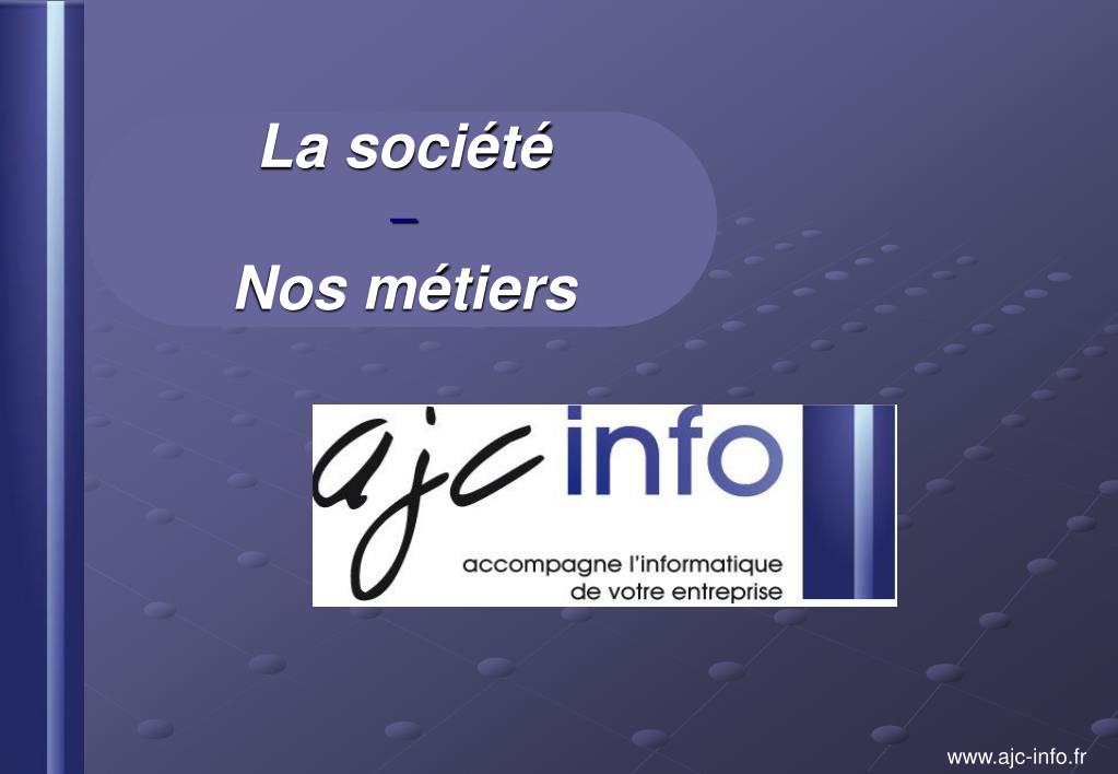La société – Nos métiers. contact@ajc-info.fr www.ajc-info.fr. La société AJC INFO. Nos Agences en Alsace et Franche-Comté. Nos Services. Fournisseur de solutions clé en main Le client dispose d’un Interlocuteur Unique. CLIENT. Logiciels de Gestion Sage.