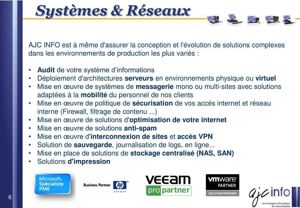 Systèmes & Réseaux • AJC INFO est à même d'assurer la conception et l'évolution de solutions complexes dans les environnements de production les plus variés : • Audit de votre système d’informations • Déploiement d'architectures serveursen environnements physique ou virtuel • Mise en œuvre de systèmes de messagerie mono ou multi-sites avec solutions adaptées à la mobilité du personnel de nos clients • Mise en œuvre de politique de sécurisation de vos accès internet et réseau interne (Firewall, filtrage de contenu ...) • Mise en œuvre de solutions d'optimisation de votre internet • Mise en œuvre de solutions anti-spam • Mise en œuvre d'interconnexion de sites et accès VPN • Solution de sauvegarde, journalisation de logs, en ligne... • Mise en place de solutions de stockage centralisé (NAS, SAN) • Solutions d'impression