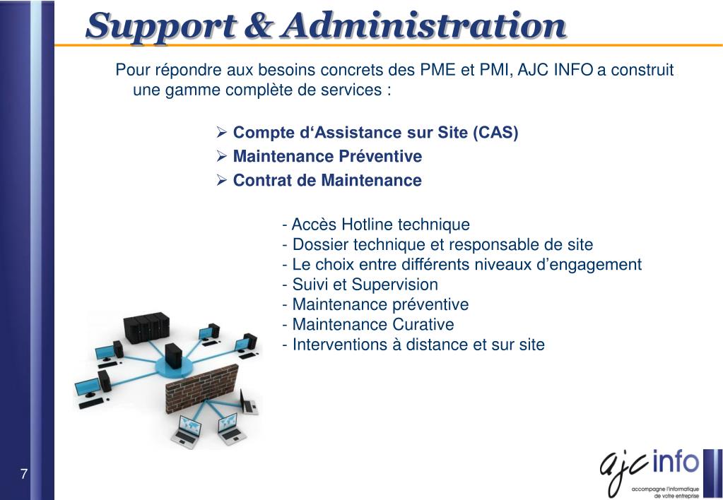 Support & Administration • Pour répondre aux besoins concrets des PME et PMI, AJC INFO a construit une gamme complète de services : • Compte d‘Assistance sur Site (CAS) • Maintenance Préventive • Contrat de Maintenance • - Accès Hotline technique- Dossier technique et responsable de site- Le choix entre différents niveaux d’engagement- Suivi et Supervision- Maintenance préventive- Maintenance Curative - Interventions à distance et sur site