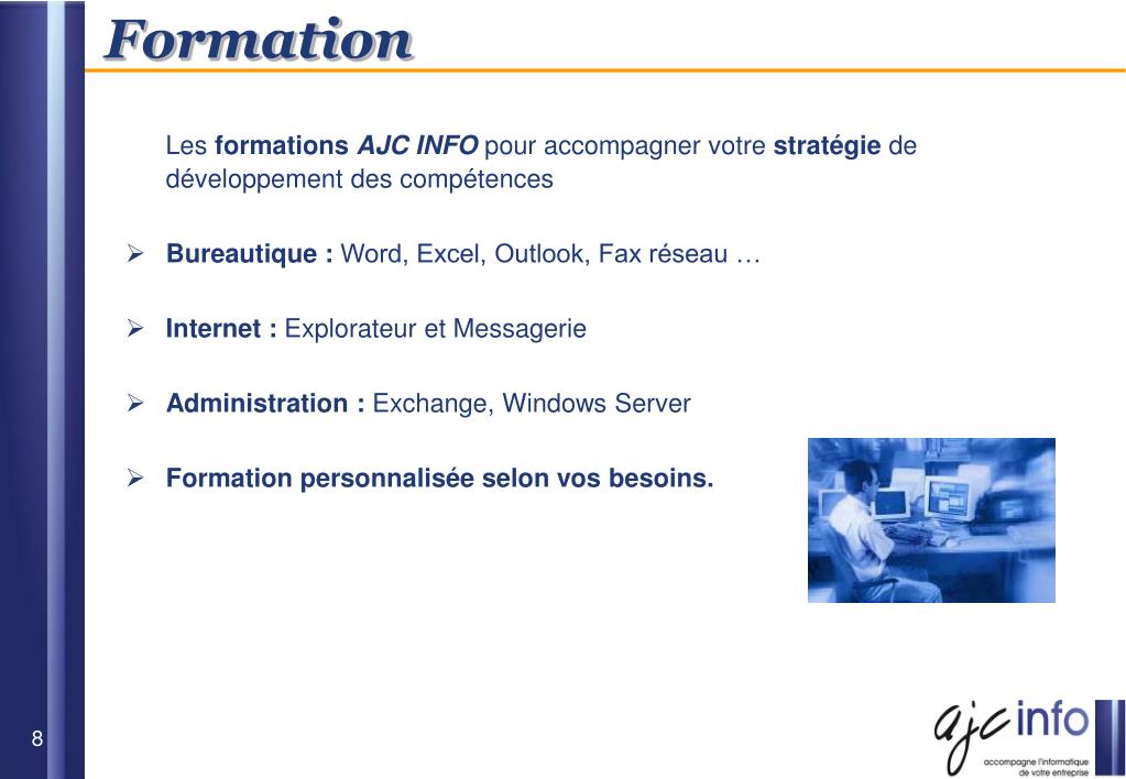 Formation • Les formations AJC INFO pour accompagner votre stratégie de développement des compétences • Bureautique : Word, Excel, Outlook, Fax réseau … • Internet : Explorateur et Messagerie • Administration : Exchange, Windows Server • Formation personnalisée selon vos besoins.