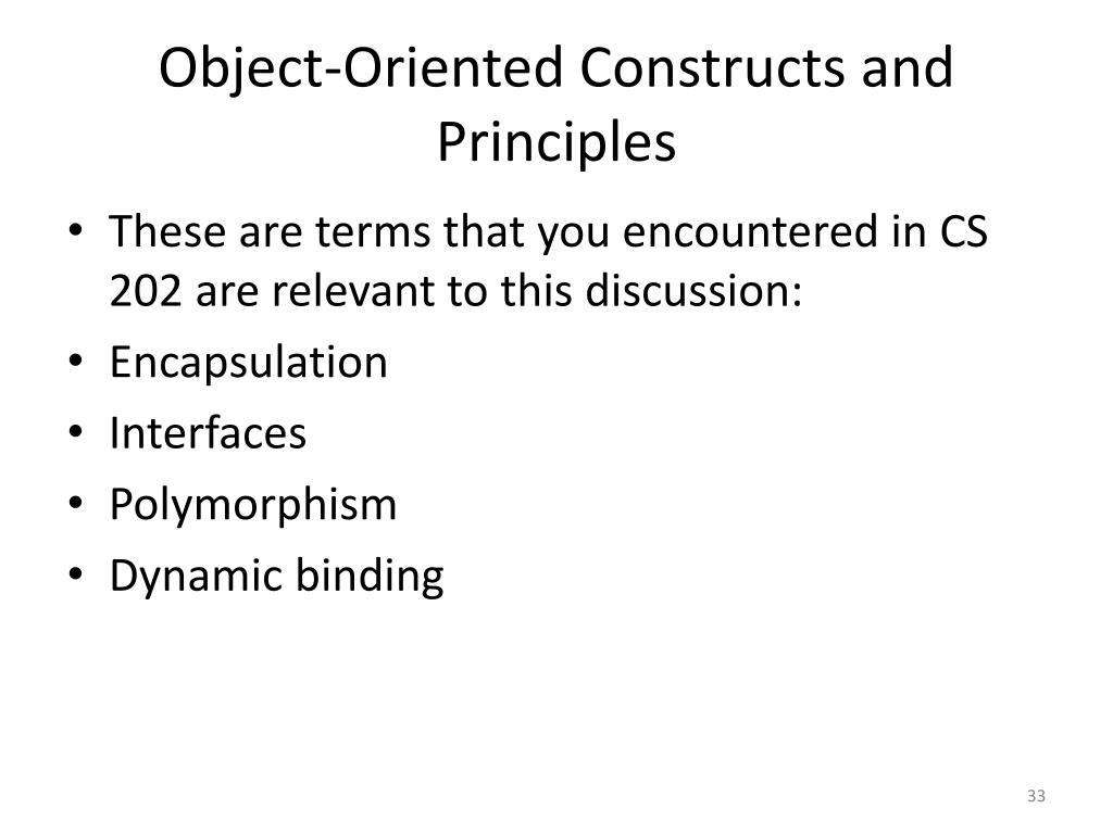 Object-Oriented Constructs and Principles • These are terms that you encountered in CS 202 are relevant to this discussion: • Encapsulation • Interfaces • Polymorphism • Dynamic binding