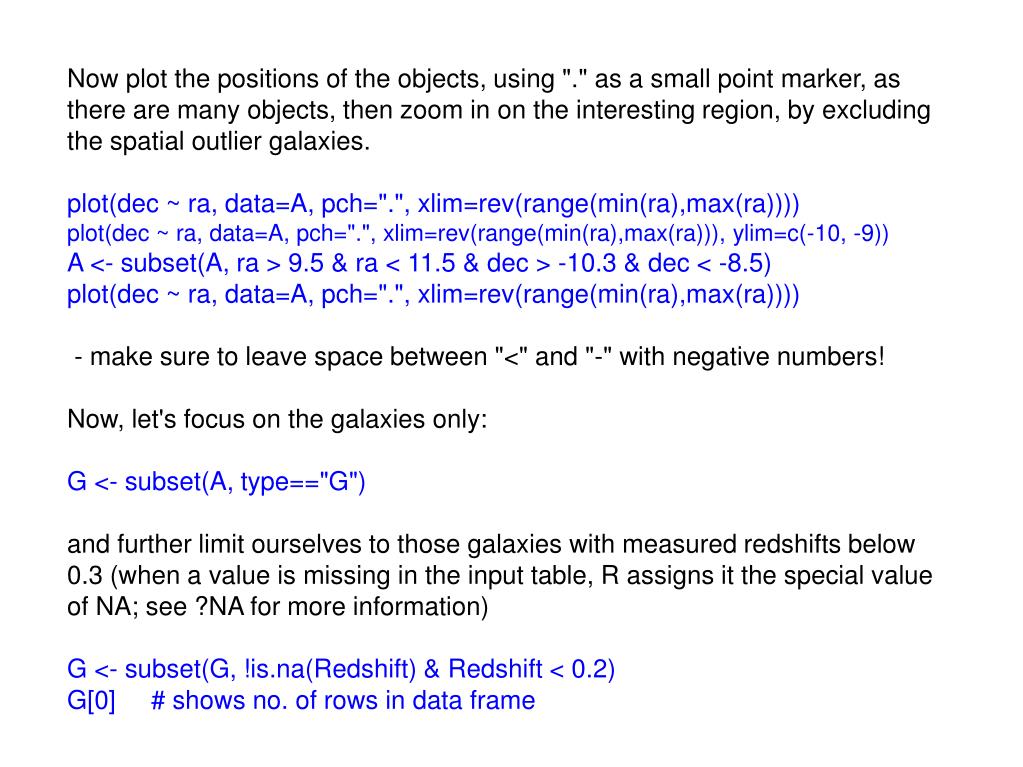 Now plot the positions of the objects, using "." as a small point marker, as there are many objects, then zoom in on the interesting region, by excluding the spatial outlier galaxies. plot(dec ~ ra, data=A, pch=".", xlim=rev(range(min(ra),max(ra)))) plot(dec ~ ra, data=A, pch=".", xlim=rev(range(min(ra),max(ra))), ylim=c(-10, -9)) A <- subset(A, ra > 9.5 & ra < 11.5 & dec > -10.3 & dec < -8.5) plot(dec ~ ra, data=A, pch=".", xlim=rev(range(min(ra),max(ra)))) - make sure to leave space between "<" and "-" with negative numbers! Now, let's focus on the galaxies only: G <- subset(A, type=="G") and further limit ourselves to those galaxies with measured redshifts below 0.3 (when a value is missing in the input table, R assigns it the special value of NA; see ?NA for more information) G <- subset(G, !is.na(Redshift) & Redshift < 0.2) G[0] # shows no. of rows in data frame