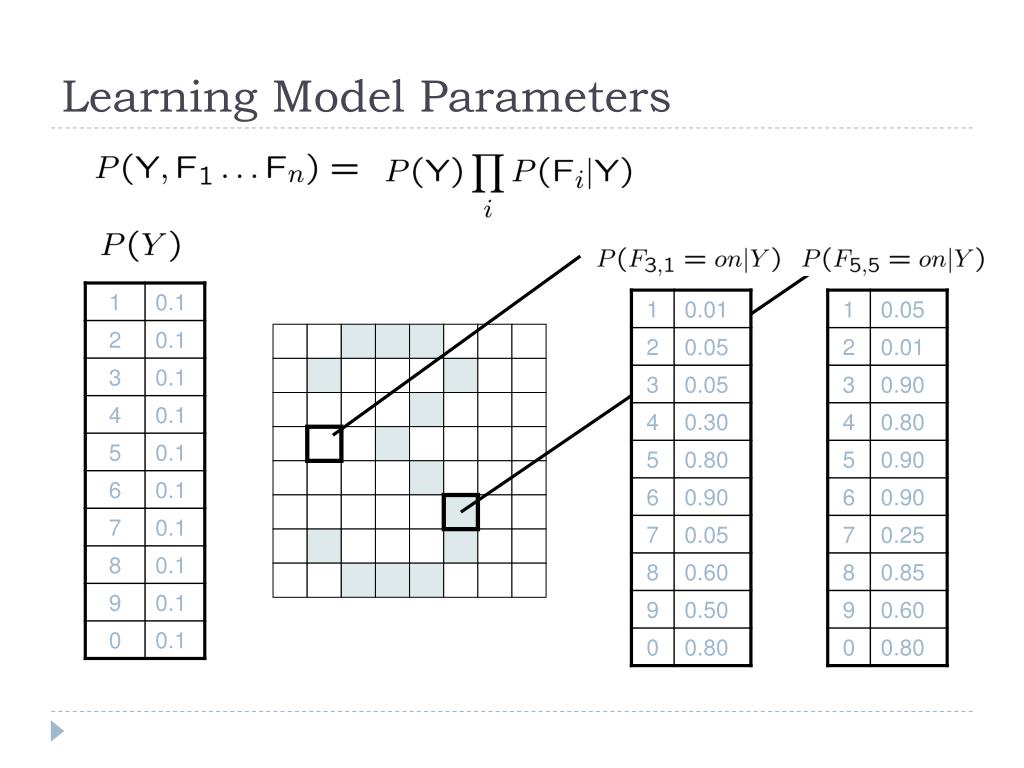 General Naïve Bayes • General probabilistic model: • General naive Bayes model: • We only specify how each feature depends on the class • Total number of parameters is linear in n |Y| x |F|nparameterss Y F1 F2 Fn n x |F| x |Y| parameters |Y| parameters