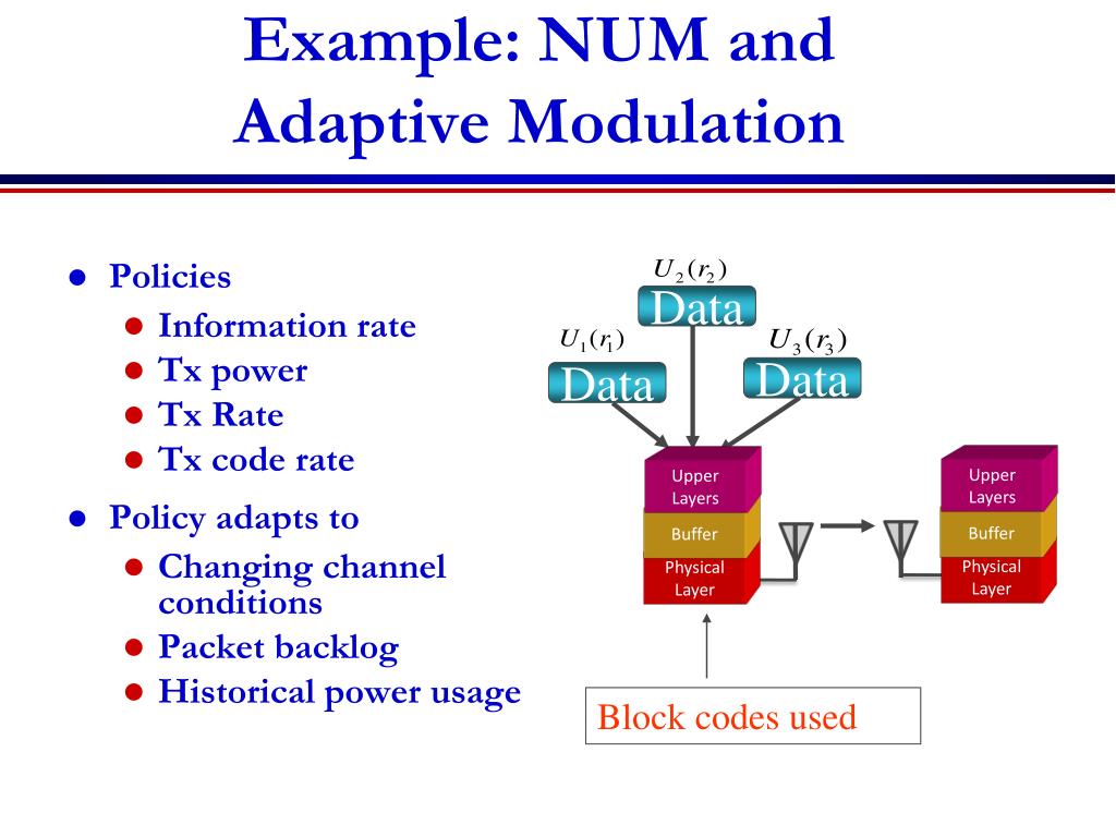 Data Data Data Upper Layers Upper Layers Buffer Buffer Physical Layer Physical Layer Example: NUM and Adaptive Modulation • Policies • Information rate • Tx power • Tx Rate • Tx code rate • Policy adapts to • Changing channel conditions • Packet backlog • Historical power usage Block codes used