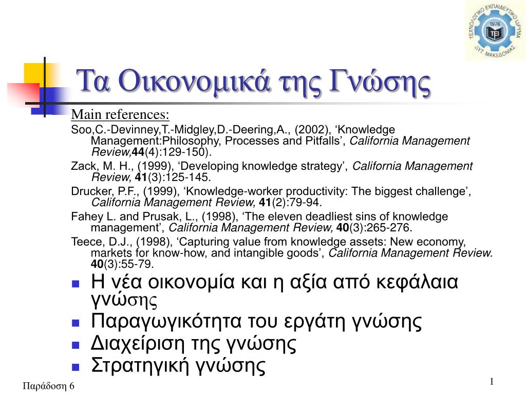 Τα Οικονομικάτης Γνώσης Main references: Soo,C.-Devinney,T.-Midgley,D.-Deering,A., (2002), ‘Knowledge Management:Philosophy, Processes and Pitfalls’, California Management Review,44(4):129-150). Zack, M. H., (1999), ‘Developing knowledge strategy’, California Management Review, 41(3):125-145. Drucker, P.F., (1999), ‘Knowledge-worker productivity: The biggest challenge’, California Management Review, 41(2):79-94. Fahey L. and Prusak, L., (1998), ‘The eleven deadliest sins of knowledge management’, California Management Review, 40(3):265-276. Teece, D.J., (1998), ‘Capturing value from knowledge assets: New economy, markets for know-how, and intangible goods’, California Management Review. 40(3):55-79. • Η νέα οικονομία και η αξία από κεφάλαια γνώσης • Παραγωγικότητα του εργάτη γνώσης • Διαχείριση της γνώσης • Στρατηγική γνώσης