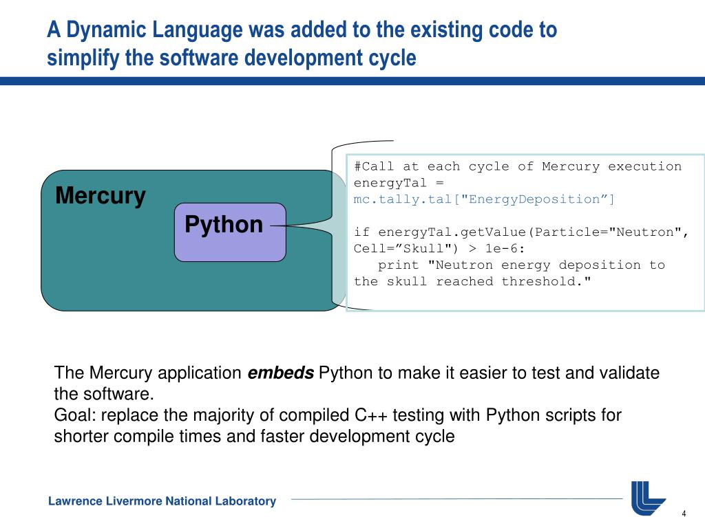 A Dynamic Language was added to the existing code to simplify the software development cycle #Call at each cycle of Mercury execution energyTal= mc.tally.tal["EnergyDeposition”] if energyTal.getValue(Particle="Neutron", Cell=”Skull") > 1e-6: print "Neutron energy deposition to the skull reached threshold." Mercury Python The Mercury application embeds Python to make it easier to test and validate the software. Goal: replace the majority of compiled C++ testing with Python scripts for shorter compile times and faster development cycle Lawrence Livermore National Laboratory