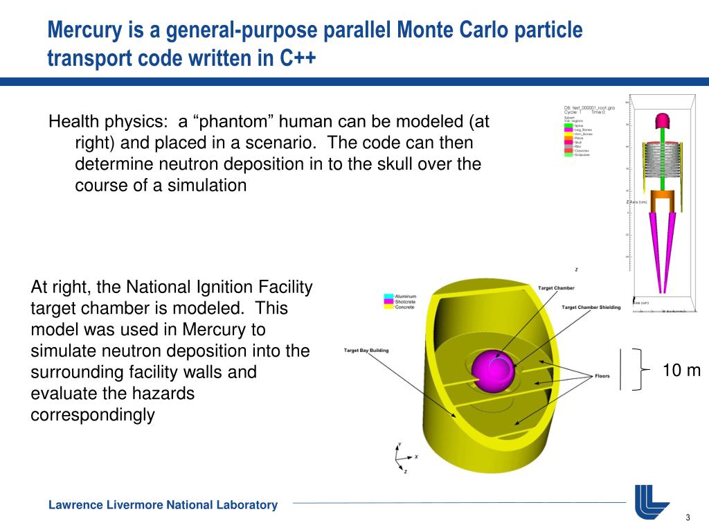 Mercury is a general-purpose parallel Monte Carlo particle transport code written in C++ At right, the National Ignition Facility target chamber is modeled. This model was used in Mercury to simulate neutron deposition into the surrounding facility walls and evaluate the hazards correspondingly 10 m Health physics: a “phantom” human can be modeled (at right) and placed in a scenario. The code can then determine neutron deposition in to the skull over the course of a simulation Lawrence Livermore National Laboratory