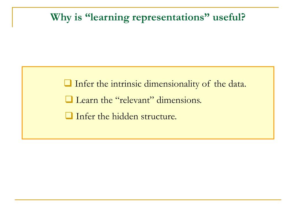 Why is “learning representations” useful? • Infer the intrinsic dimensionality of the data. • Learn the “relevant” dimensions. • Infer the hidden structure.
