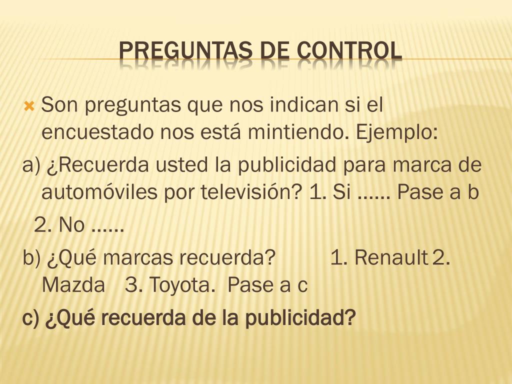 Son preguntas que nos indican si el encuestado nos está mintiendo. Ejemplo: a) ¿Recuerda usted la publicidad para marca de automóviles por televisión? 1. Si ...... Pase a b 2. No ...... b) ¿Qué marcas recuerda? 1. Renault 2. Mazda 3. Toyota. Pase a c c) ¿Qué recuerda de la publicidad? Preguntas de control
