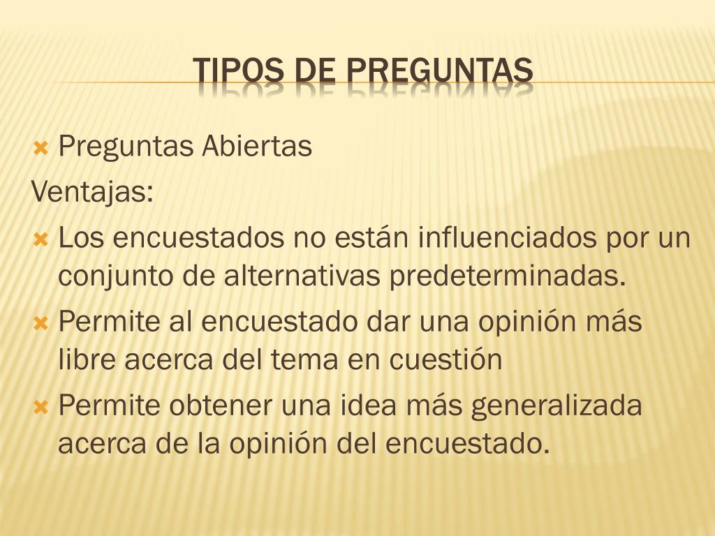 Preguntas Abiertas Ventajas: Los encuestados no están influenciados por un conjunto de alternativas predeterminadas. Permite al encuestado dar una opinión más libre acerca del tema en cuestión Permite obtener una idea más generalizada acerca de la opinión del encuestado. TIPOS DE PREGUNTAS