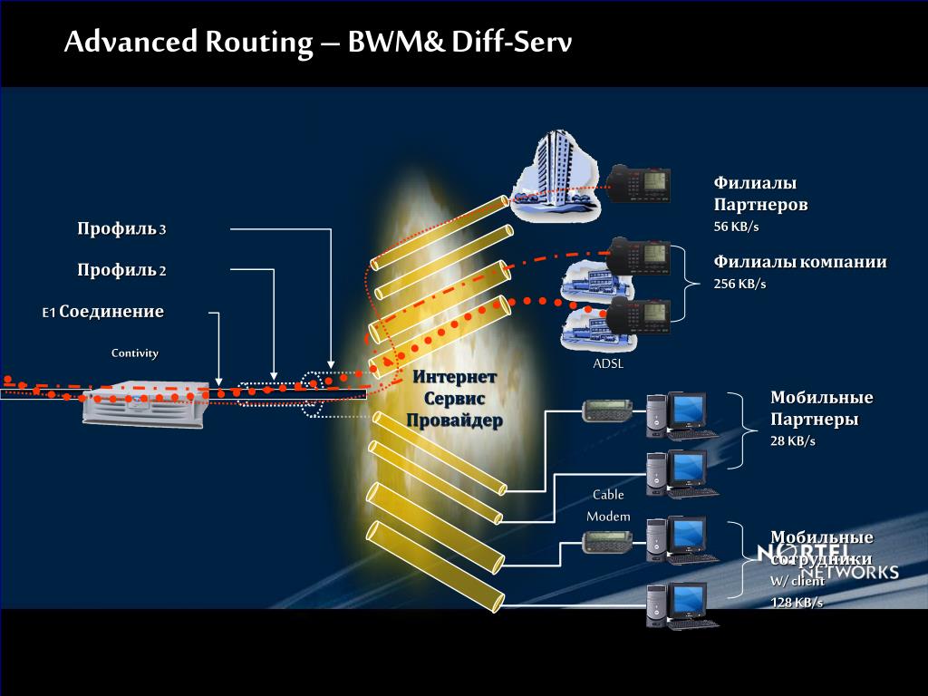 Contivity Advanced Routing – BWM& Diff-Serv Филиалы Партнеров 56 KB/s Профиль 3 Филиалы компании 256 KB/s Профиль 2 E1 Соединение ADSL Интернет Сервис Провайдер Мобильные Партнеры 28 KB/s Cable Modem Мобильные сотрудники W/ client 128 KB/s