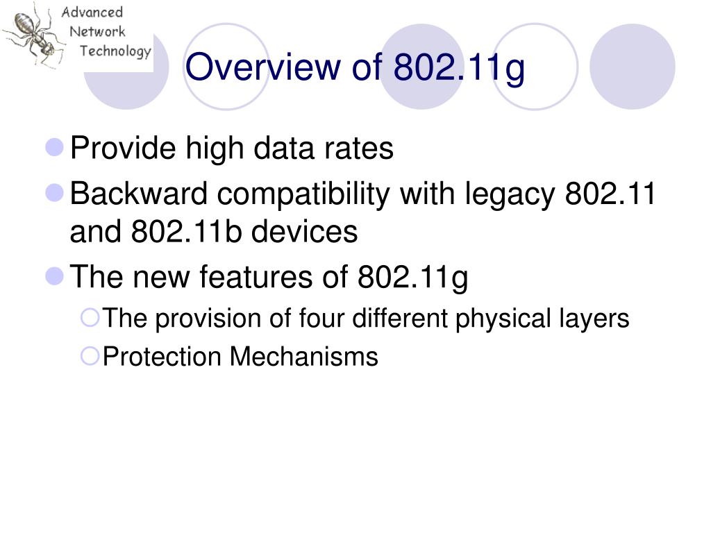 Overview of 802.11g • Provide high data rates • Backward compatibility with legacy 802.11 and 802.11b devices • The new features of 802.11g • The provision of four different physical layers • Protection Mechanisms