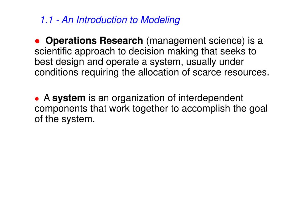 1.1 - An Introduction to Modeling • Operations Research (management science) is a scientific approach to decision making that seeks to best design and operate a system, usually under conditions requiring the allocation of scarce resources. • A system is an organization of interdependent components that work together to accomplish the goal of the system.