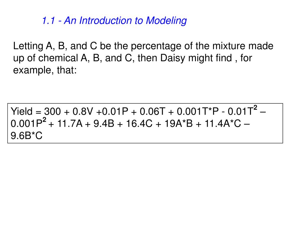 1.1 - An Introduction to Modeling Letting A, B, and C be the percentage of the mixture made up of chemical A, B, and C, then Daisy might find , for example, that: Yield = 300 + 0.8V +0.01P + 0.06T + 0.001T*P - 0.01T2 – 0.001P2 + 11.7A + 9.4B + 16.4C + 19A*B + 11.4A*C – 9.6B*C