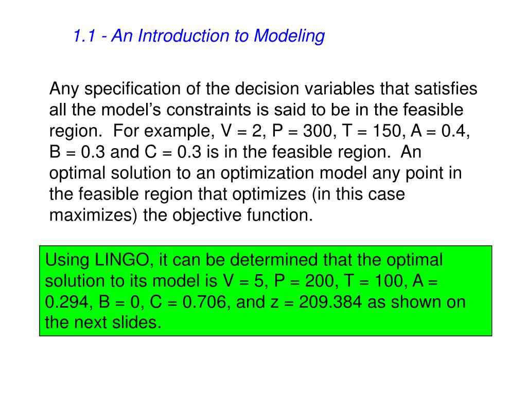 1.1 - An Introduction to Modeling Any specification of the decision variables that satisfies all the model’s constraints is said to be in the feasible region. For example, V = 2, P = 300, T = 150, A = 0.4, B = 0.3 and C = 0.3 is in the feasible region. An optimal solution to an optimization model any point in the feasible region that optimizes (in this case maximizes) the objective function. Using LINGO, it can be determined that the optimal solution to its model is V = 5, P = 200, T = 100, A = 0.294, B = 0, C = 0.706, and z = 209.384 as shown on the next slides.