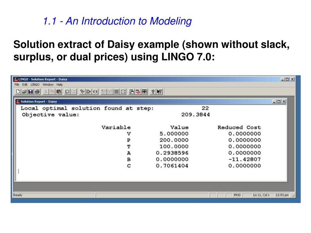 1.1 - An Introduction to Modeling Solution extract of Daisy example (shown without slack, surplus, or dual prices) using LINGO 7.0: