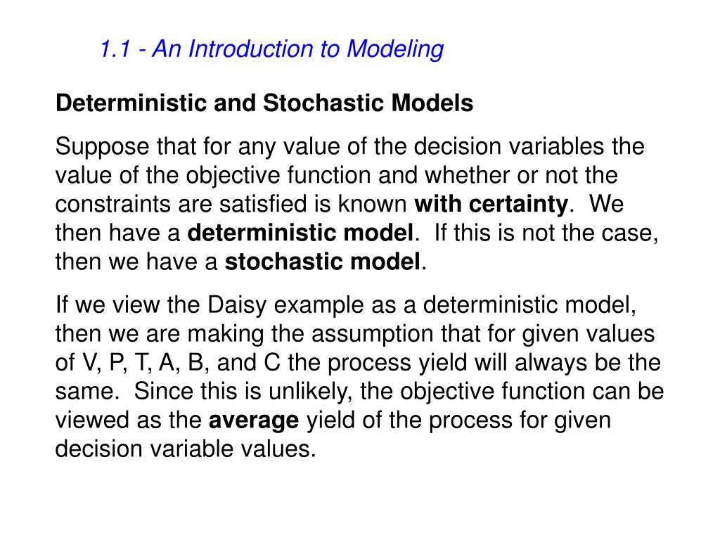 1.1 - An Introduction to Modeling Deterministic and Stochastic Models Suppose that for any value of the decision variables the value of the objective function and whether or not the constraints are satisfied is known with certainty. We then have a deterministic model. If this is not the case, then we have a stochastic model. If we view the Daisy example as a deterministic model, then we are making the assumption that for given values of V, P, T, A, B, and C the process yield will always be the same. Since this is unlikely, the objective function can be viewed as the average yield of the process for given decision variable values.