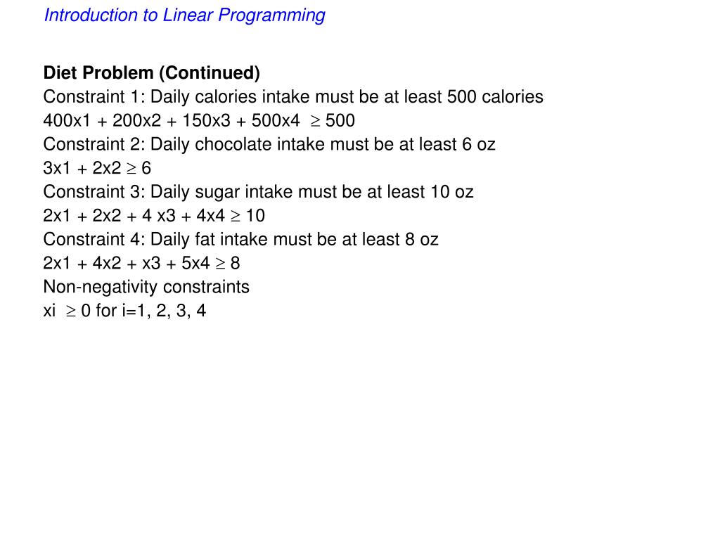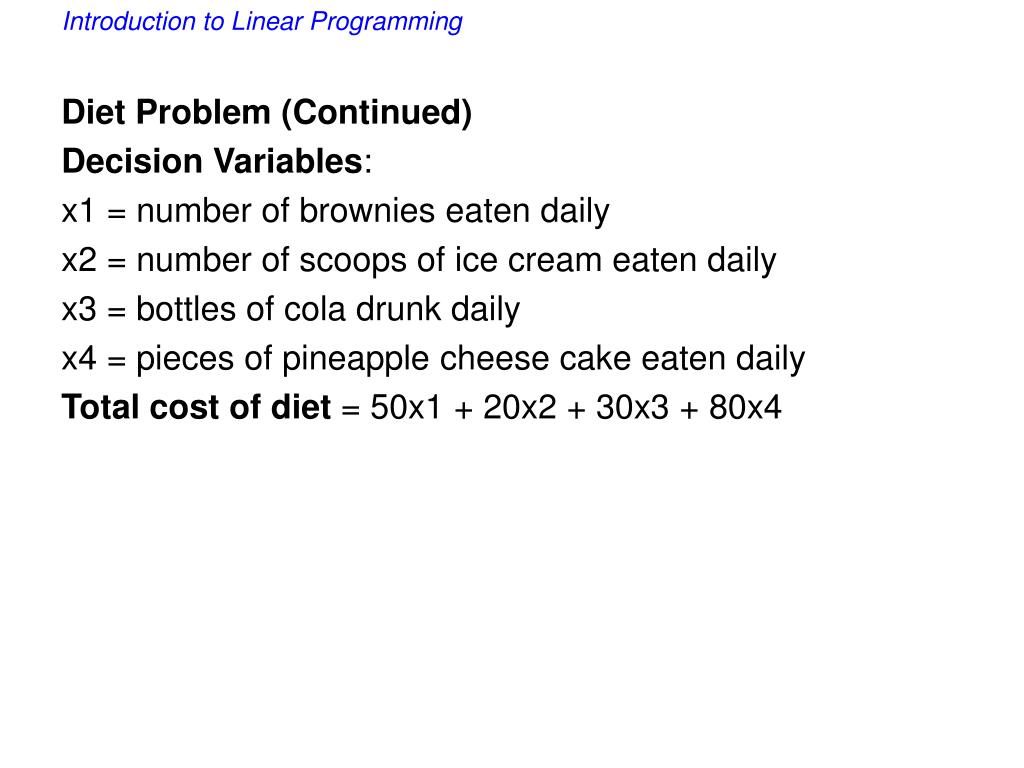 Introduction to Linear Programming • Diet Problem (Continued) • Decision Variables: • x1 = number of brownies eaten daily • x2 = number of scoops of ice cream eaten daily • x3 = bottles of cola drunk daily • x4 = pieces of pineapple cheese cake eaten daily • Total cost of diet = 50x1 + 20x2 + 30x3 + 80x4