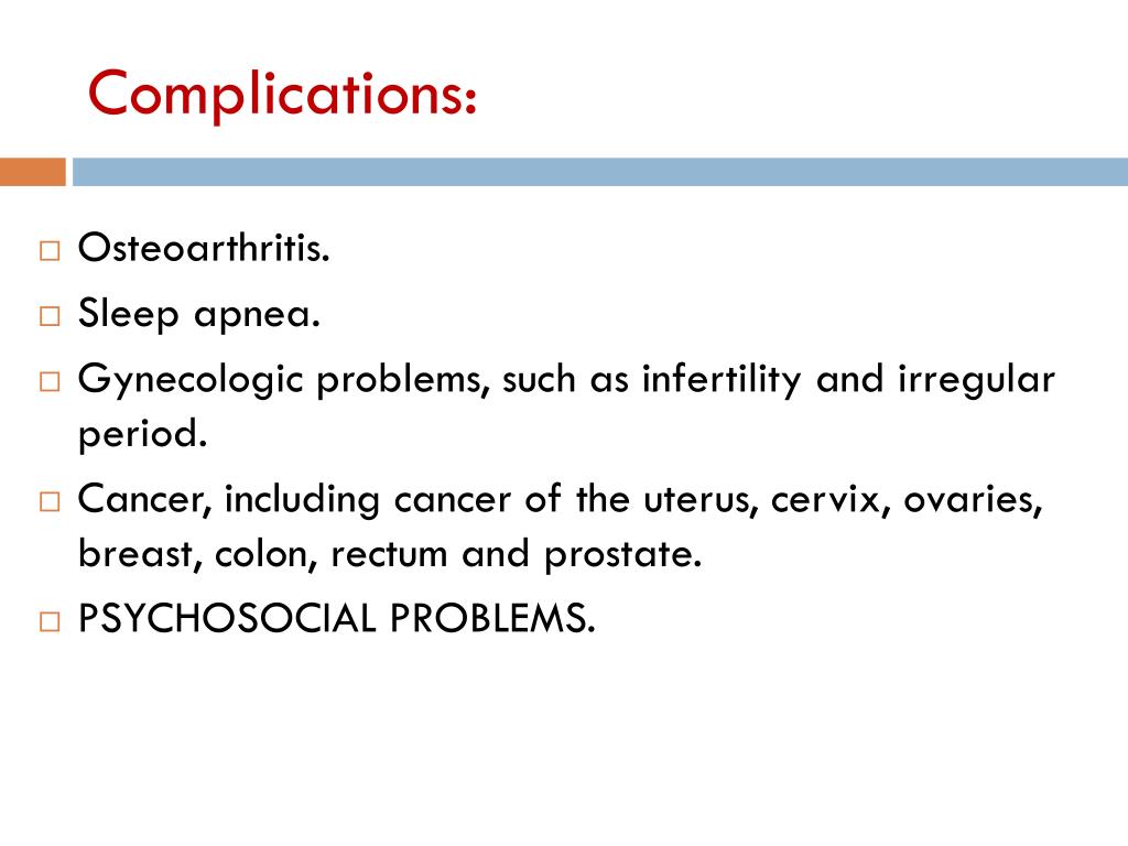 Complications: • Osteoarthritis. • Sleep apnea. • Gynecologic problems, such as infertility and irregular period. • Cancer, including cancer of the uterus, cervix, ovaries, breast, colon, rectum and prostate. • PSYCHOSOCIAL PROBLEMS.