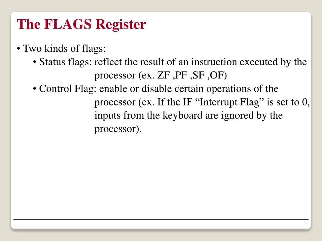 The FLAGS Register • Two kinds of flags: • Status flags: reflect the result of an instruction executed by the • processor (ex. ZF ,PF ,SF ,OF) • Control Flag: enable or disable certain operations of the • processor (ex. If the IF “Interrupt Flag” is set to 0, • inputs from the keyboard are ignored by the • processor).