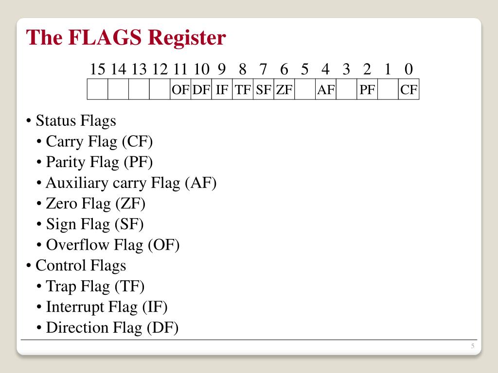 The FLAGS Register 15 14 13 12 11 10 9 8 7 6 5 4 3 2 1 0 OF DF IF TF SF ZF AF PF CF • Status Flags • Carry Flag (CF) • Parity Flag (PF) • Auxiliary carry Flag (AF) • Zero Flag (ZF) • Sign Flag (SF) • Overflow Flag (OF) • Control Flags • Trap Flag (TF) • Interrupt Flag (IF) • Direction Flag (DF)