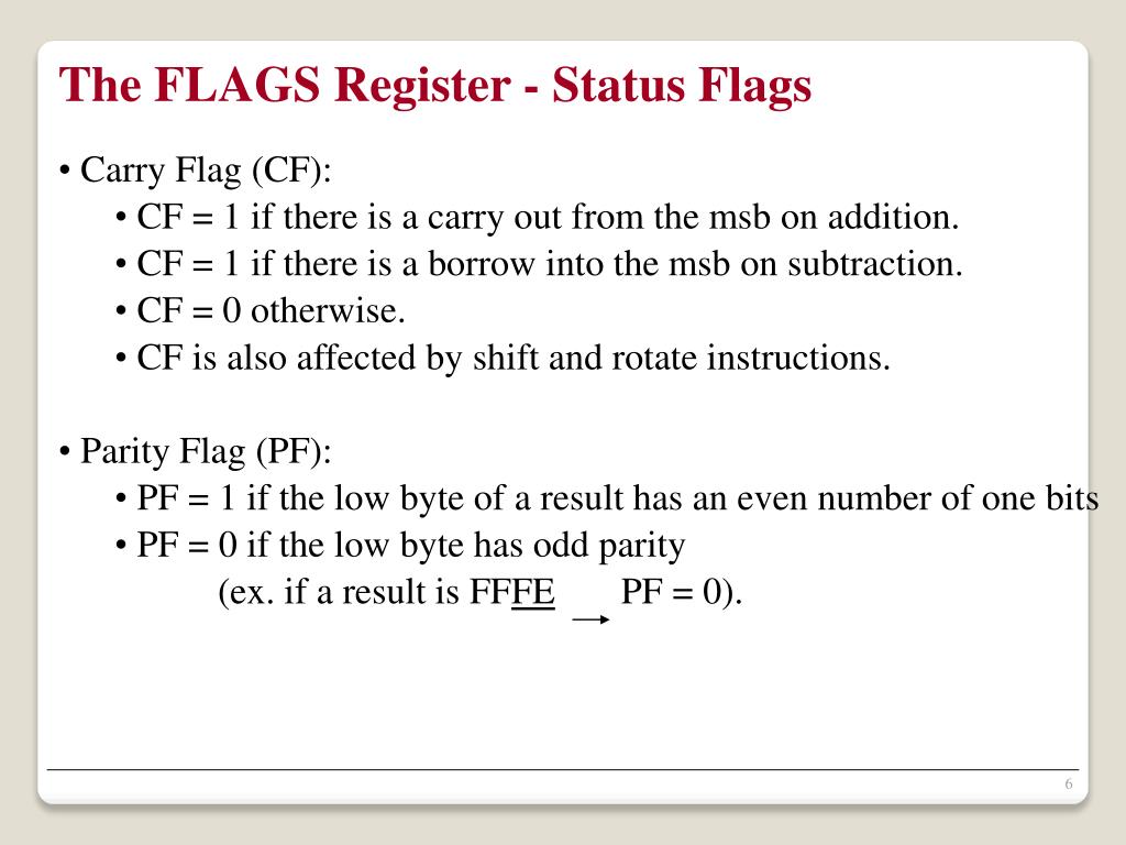 The FLAGS Register - Status Flags • Carry Flag (CF): • CF = 1 if there is a carry out from the msb on addition. • CF = 1 if there is a borrow into the msb on subtraction. • CF = 0 otherwise. • CF is also affected by shift and rotate instructions. • Parity Flag (PF): • PF = 1 if the low byte of a result has an even number of one bits • PF = 0 if the low byte has odd parity • (ex. if a result is FFFE PF = 0).