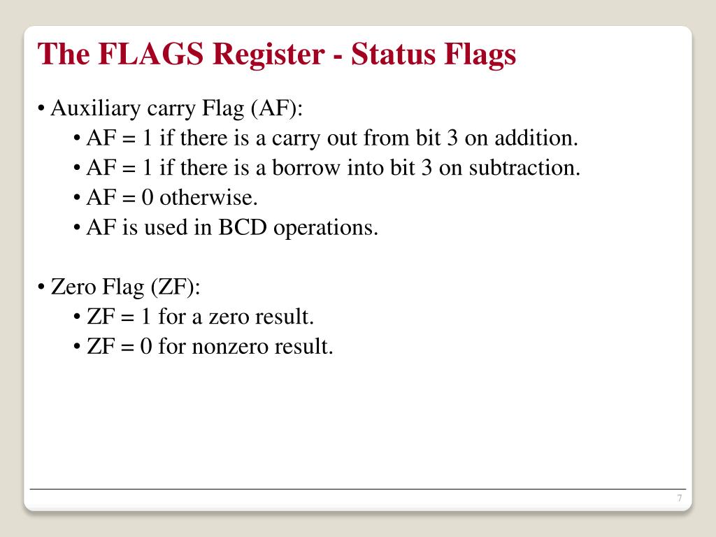 The FLAGS Register - Status Flags • Auxiliary carry Flag (AF): • AF = 1 if there is a carry out from bit 3 on addition. • AF = 1 if there is a borrow into bit 3 on subtraction. • AF = 0 otherwise. • AF is used in BCD operations. • Zero Flag (ZF): • ZF = 1 for a zero result. • ZF = 0 for nonzero result.