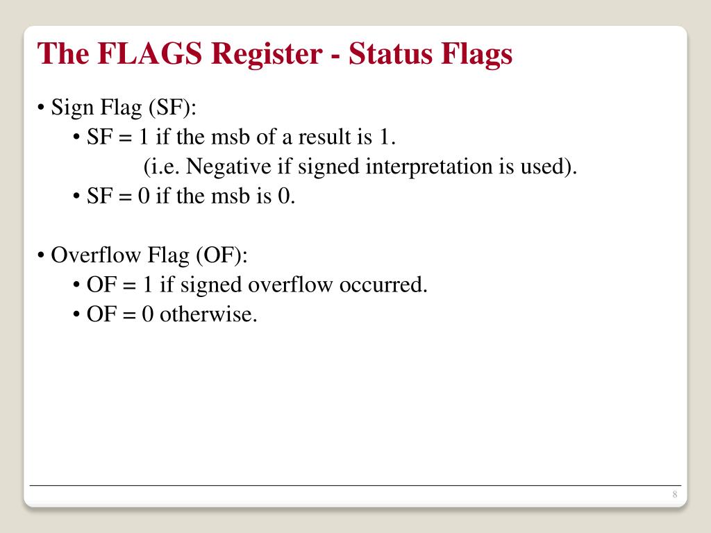 The FLAGS Register - Status Flags • Sign Flag (SF): • SF = 1 if the msb of a result is 1. • (i.e. Negative if signed interpretation is used). • SF = 0 if the msb is 0. • Overflow Flag (OF): • OF = 1 if signed overflow occurred. • OF = 0 otherwise.