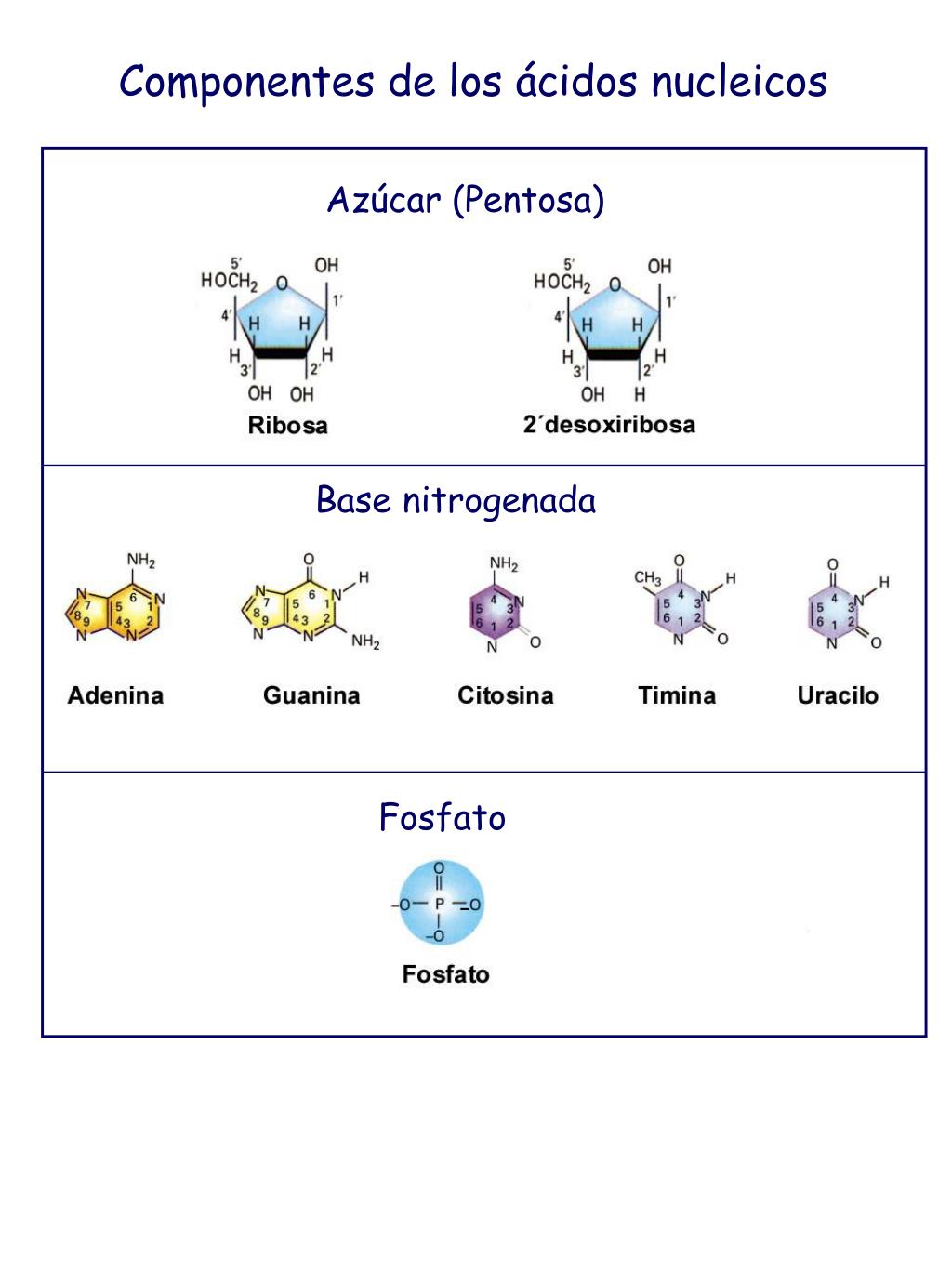 Componentes de los ácidos nucleicos Azúcar (Pentosa) Base nitrogenada Fosfato