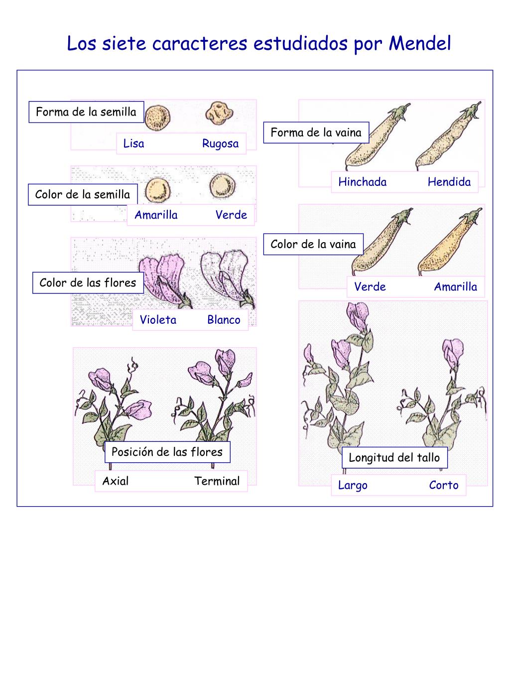 Forma de la semilla Forma de la vaina Lisa Rugosa Hinchada Hendida Color de la semilla Amarilla Verde Color de la vaina Color de las flores Verde Amarilla Violeta Blanco Posición de las flores Longitud del tallo Axial Terminal Largo Corto Los siete caracteres estudiados por Mendel