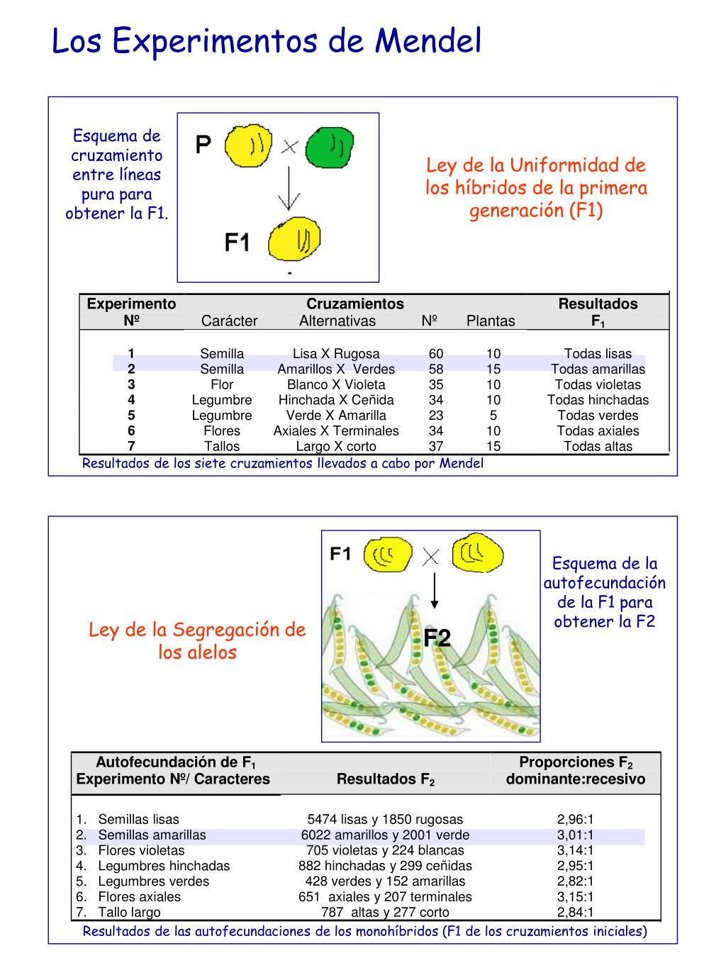 F2 Resultados de las autofecundaciones de los monohíbridos (F1 de los cruzamientos iniciales) Los Experimentos de Mendel Esquema de cruzamiento entre líneas pura para obtener la F1. Ley de la Uniformidad de los híbridos de la primera generación (F1) Resultados de los siete cruzamientos llevados a cabo por Mendel Esquema de la autofecundación de la F1 para obtener la F2 Ley de la Segregación de los alelos