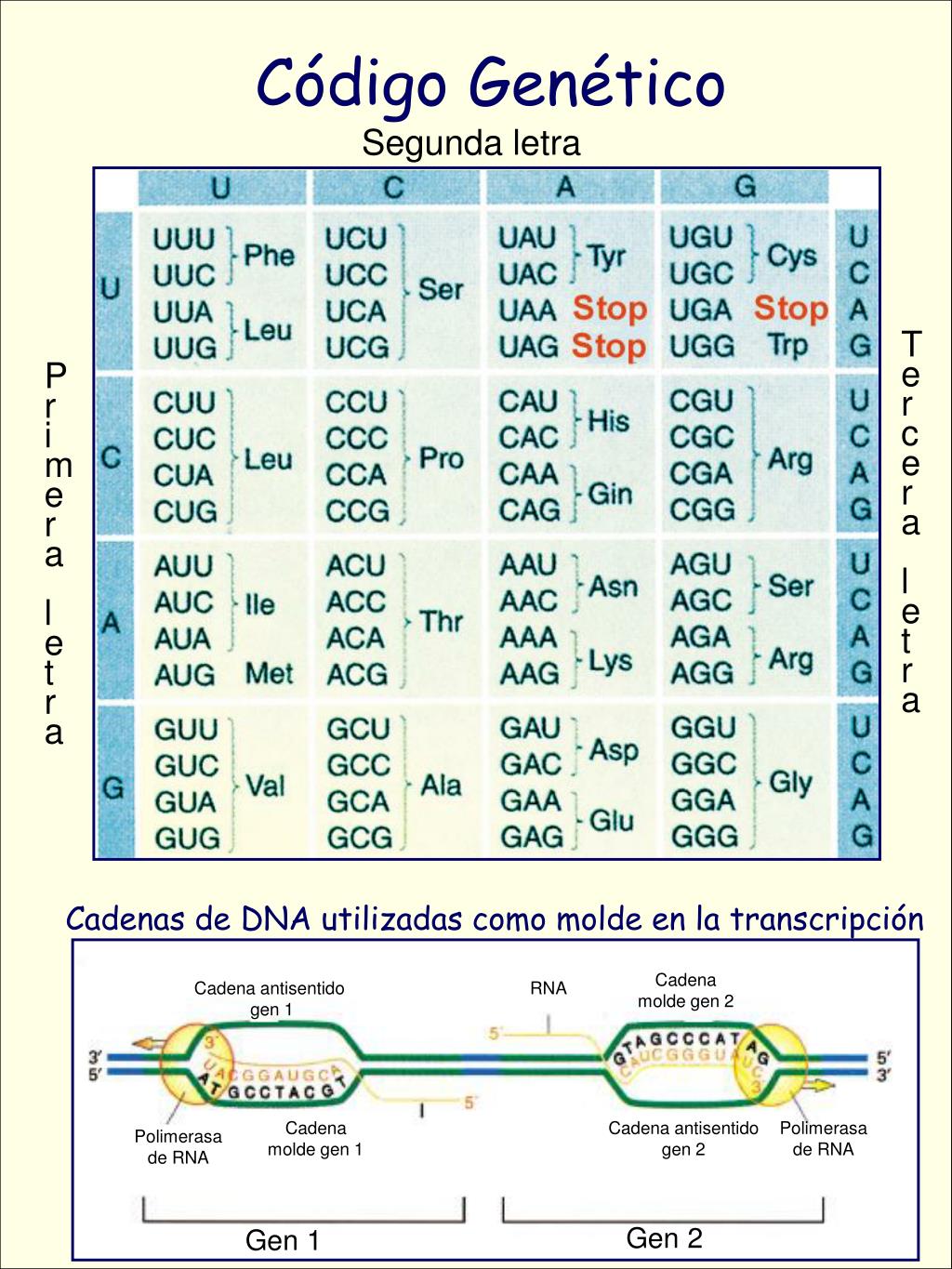 Cadena molde gen 2 Cadena antisentido gen 1 RNA Cadena molde gen 1 Cadena antisentido gen 2 Polimerasa de RNA Polimerasa de RNA Gen 2 Gen 1 Código Genético Segunda letra Ter cera l e t ra Pr imera l e t ra Cadenas de DNA utilizadas como molde en la transcripción