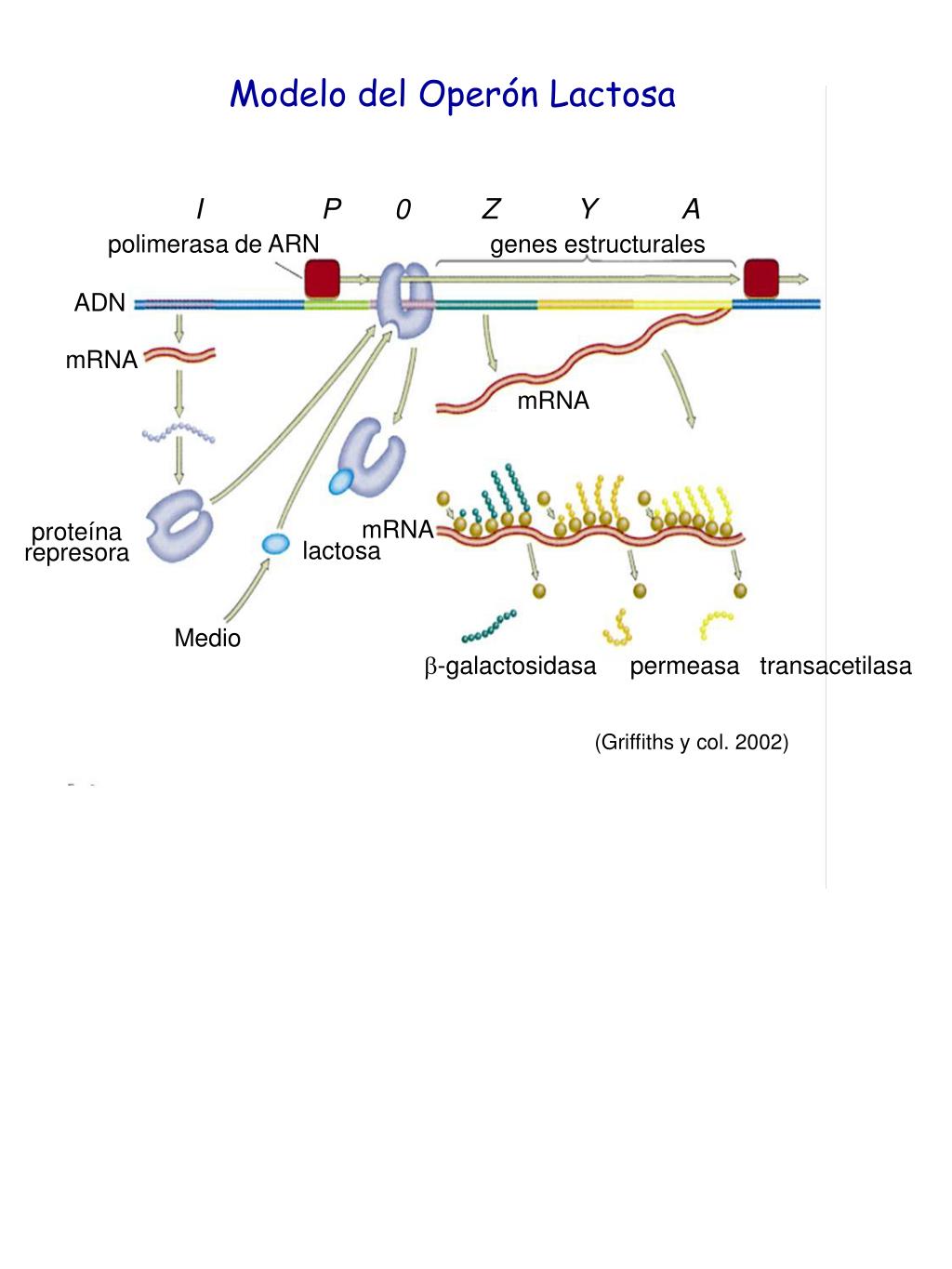 Modelo del Operón Lactosa I P 0 Z Y A polimerasa de ARN genes estructurales ADN mRNA mRNA mRNA proteína represora lactosa Medio -galactosidasa permeasa transacetilasa (Griffiths y col. 2002)